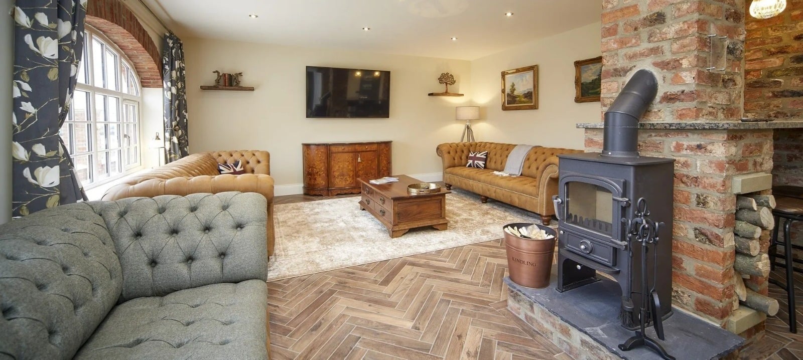 Opposite the entrance, a small bar area, equipped with a drinks fridge and freezer, has everything you’d need to mix a drink. Moving on from the bar, we find the sitting area, with two Chesterfield sofas, a freestanding log burner, and a wall-mounted TV for entertainment. This space also features a ceiling light made from a seed drill wheel, further adding to the unique charm of the space.