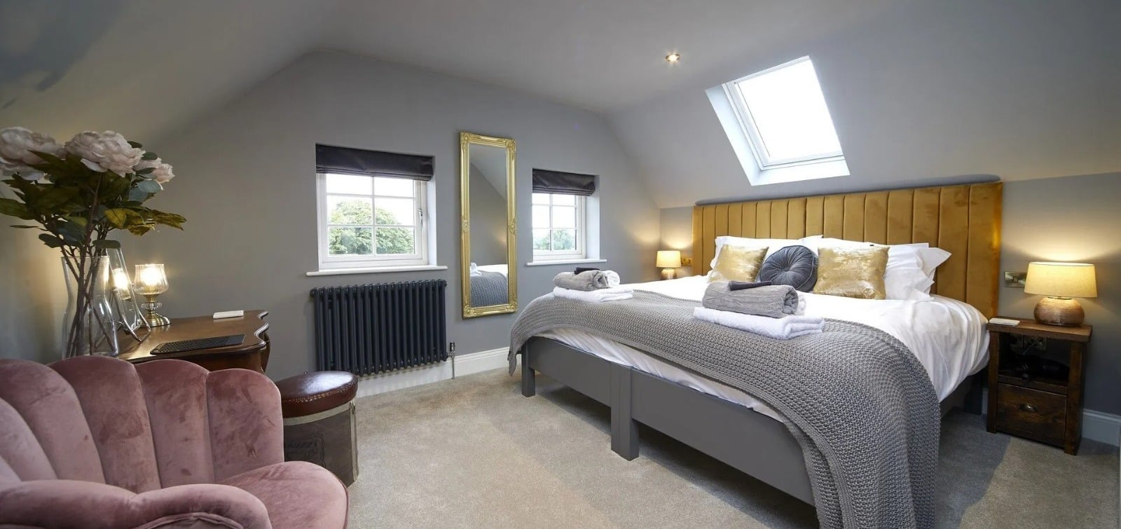 - Bedroom 6 - This room is similar to bedroom 6 but boasts a gorgeous Manor House Grey (F&B) colour palette and a unique purple armchair that ties the space together and compliments the yellow headboard.